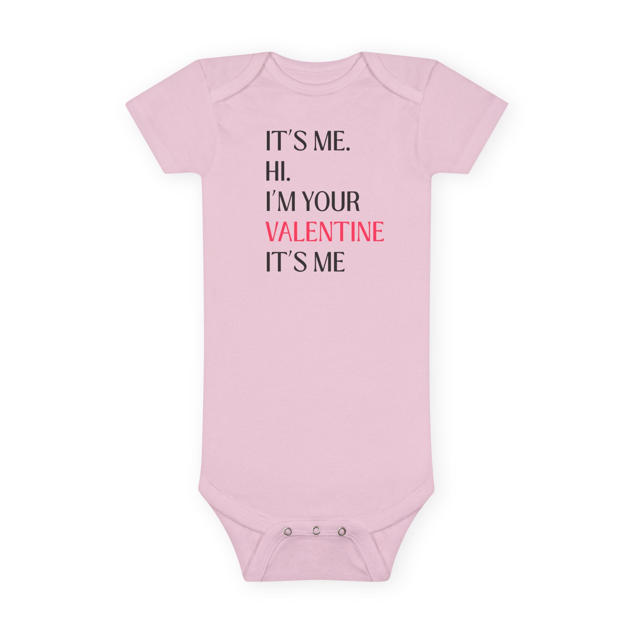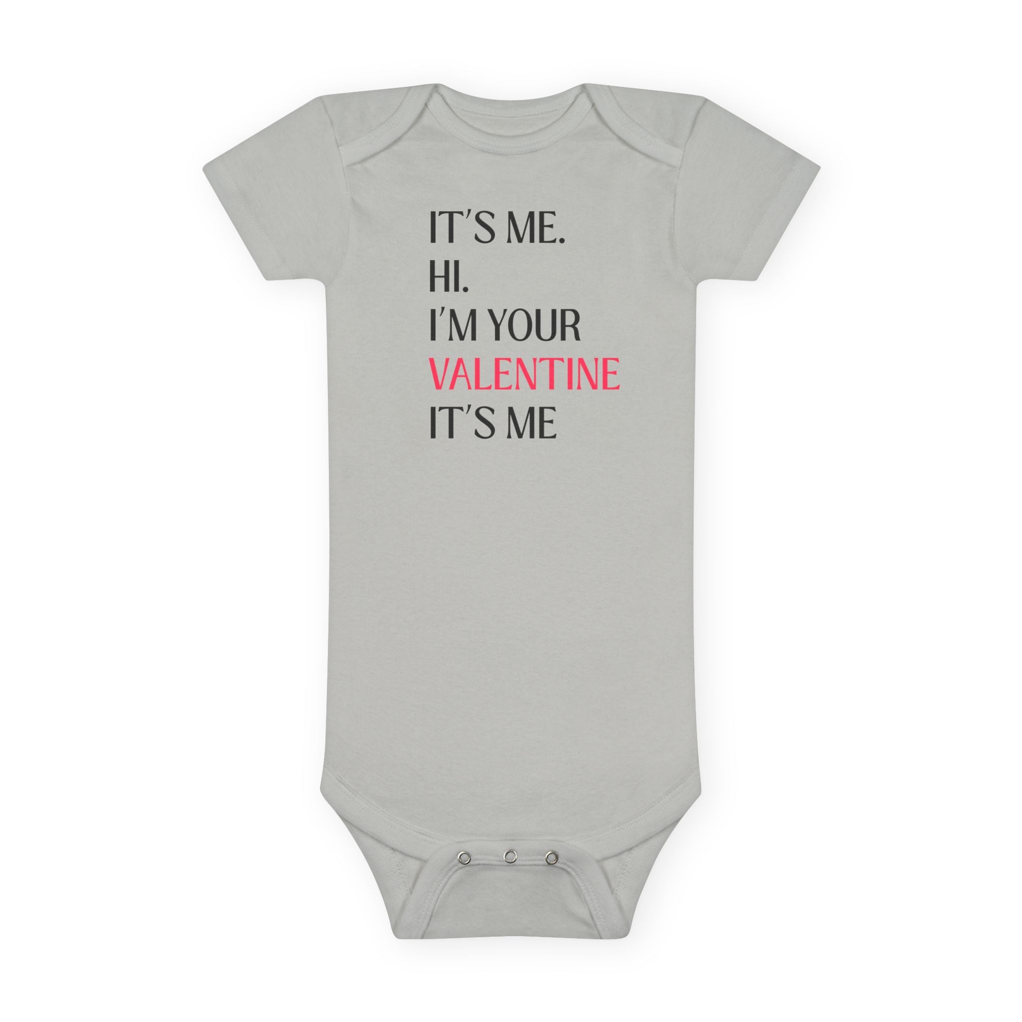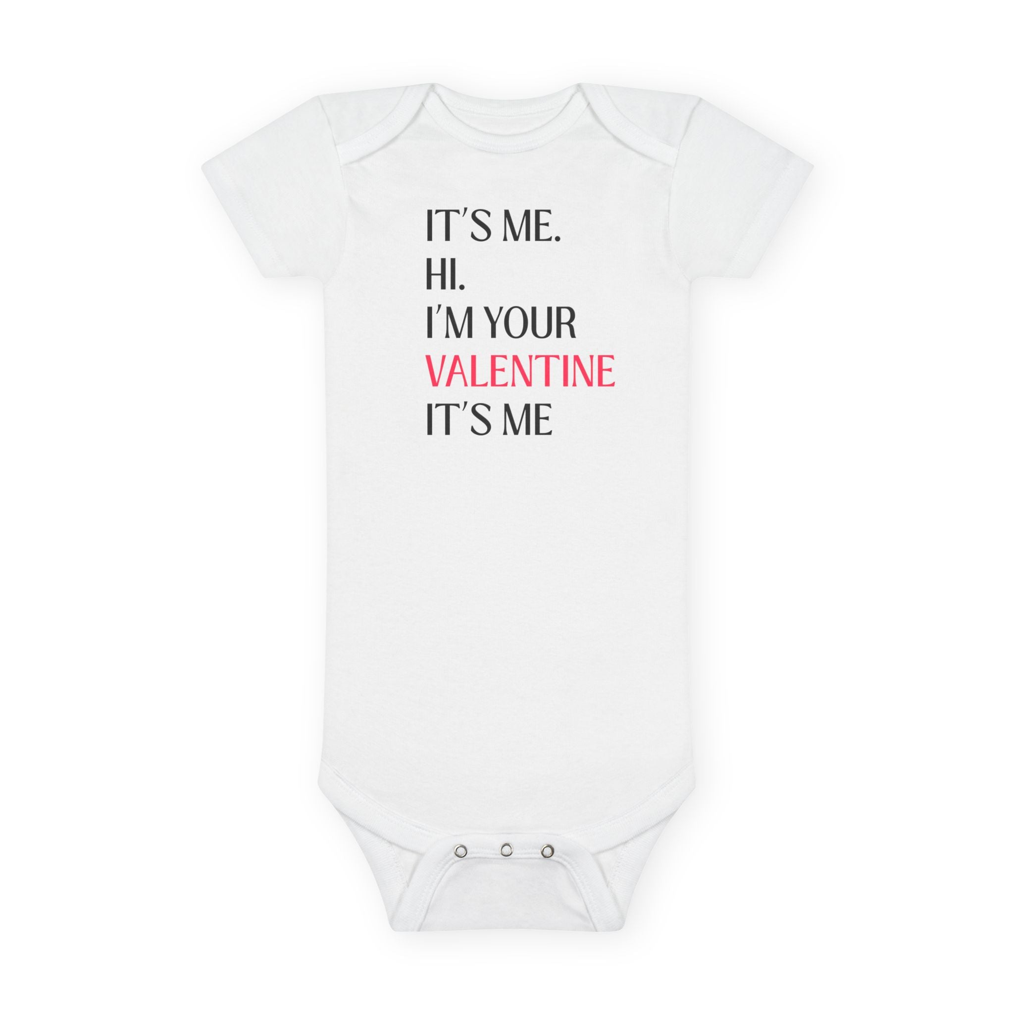 A soft, pure-cotton onesie with a playful Valentine’s message that reads like a tiny declaration: “IT’S ME. HI. I’M YOUR VALENTINE. IT’S ME.” Subtle pink ink highlights the word Valentine for a gentle pop of color against crisp white fabric. The expandable lap shoulder neckline and higher-positioned snap closure make dressing and quick changes easier, while ribbed leg openings keep the fit snug and comfortable as baby wiggles through the day. Lightweight and smooth to the touch, this onesie settles into everyday life — from sleepy morning cuddles to cozy family photos — with an affectionate, quietly witty vibe.
