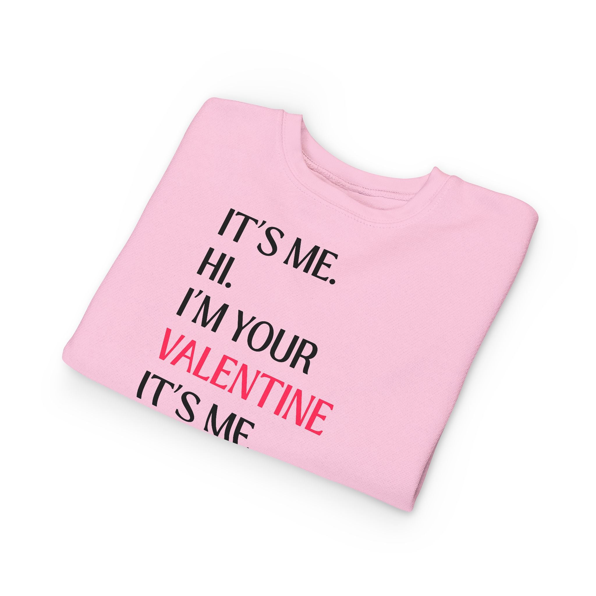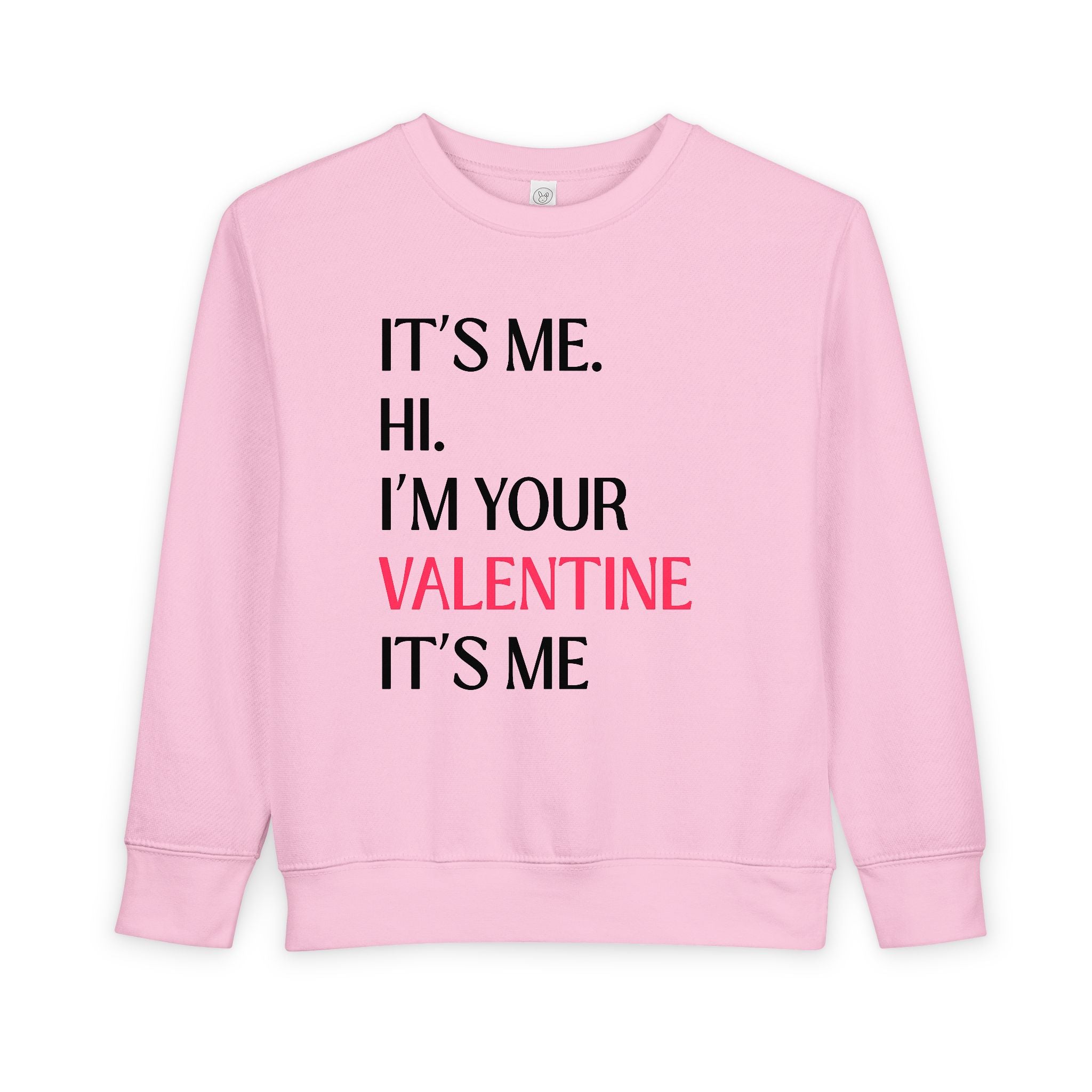 Light, playful, and full of heart — this toddler sweatshirt brings a tiny burst of Valentine’s mischief to chilly days. Soft cotton-blend fabric wraps little ones in gentle warmth while the bold, friendly type reads like a whisper from a cheeky child: “It’s me. Hi. I’m your Valentine. It’s me.” The pink backdrop and pop of bright lettering read like a mini love note, perfect for playground hugs, storytime snuggles, and family photos that will be kept in a memory box. Thoughtful construction — ribbed cuffs and hem, coverstitched seams, and a tear-away label — keeps comfort front and center so parents and caregivers can relax while the kiddo steals the show.